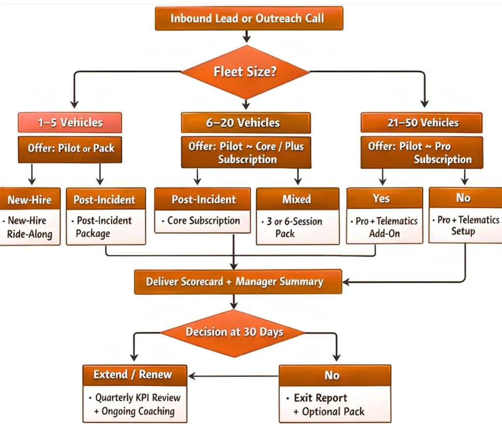 1–5 vehicles6‑Session Packper pack$1,380Any 6 standard ride-alongs; quarterly KPI summary; scheduling priorityFleets that hire frequently or have recurring issues
